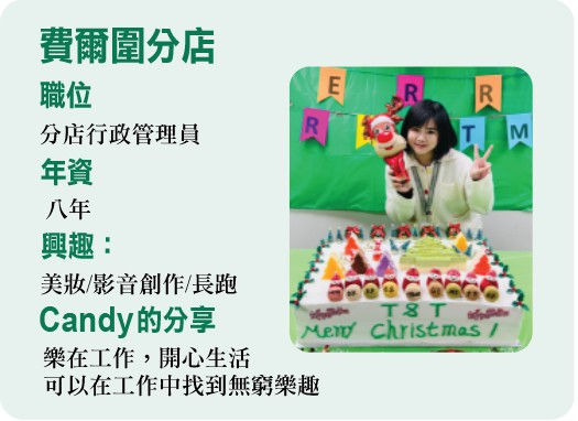 分店推薦語 - Candy在過去兩年擔任分店行政管理員期間,於門店快速成長中展現卓越行政管理能力,提供高效穩定支持,強化組織架構,並協助門店於2025年達成Top 5生產力表現。